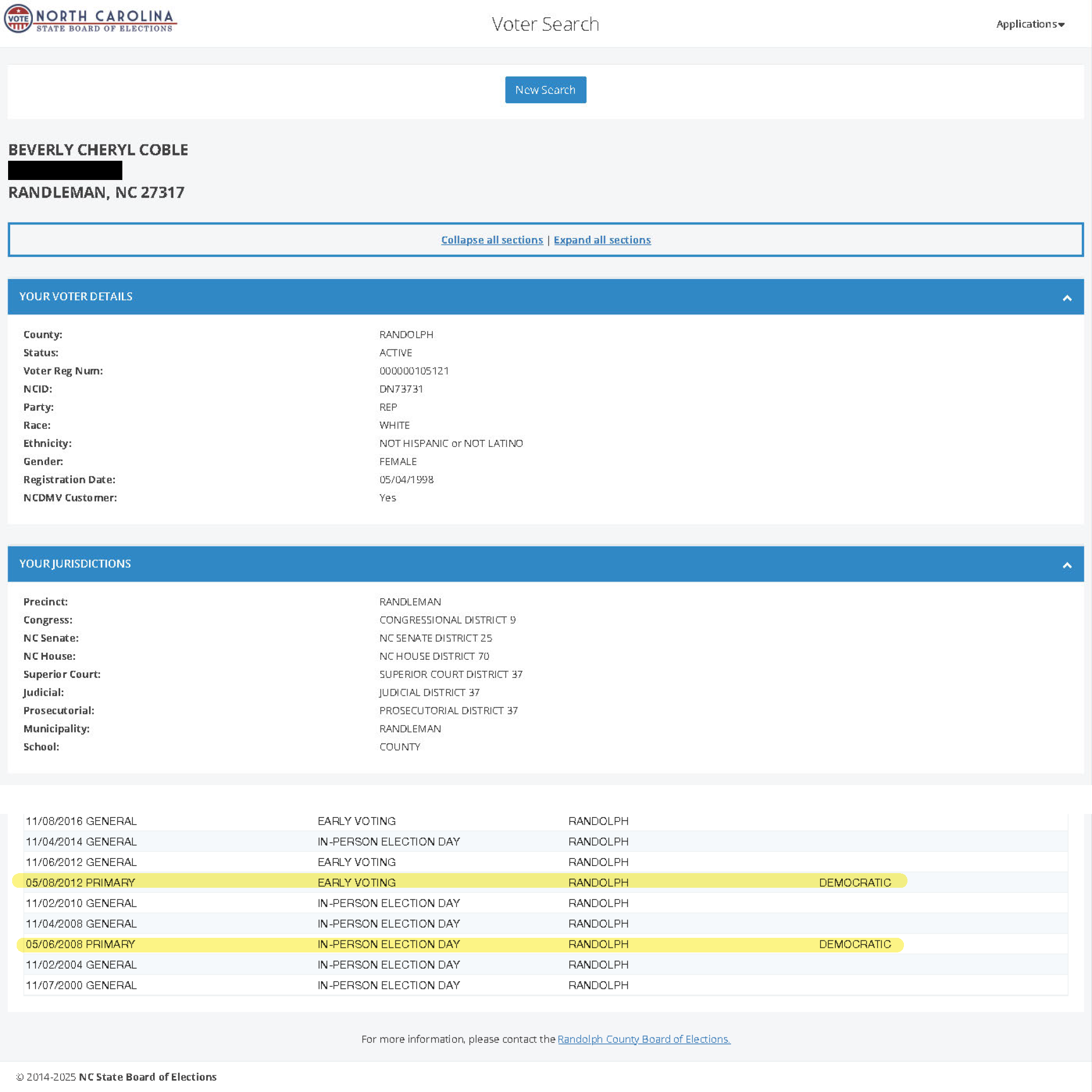 Voter history from the North Carolina Board of Elections showing Ms. Coble voting Democrat in 2008 and 2012.
